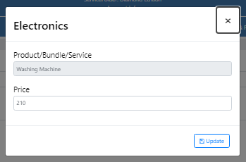 4. To update the product click the Edit link. A pop-up shows for the product where the item's price can be updated. Click the Delete link to delete the product.